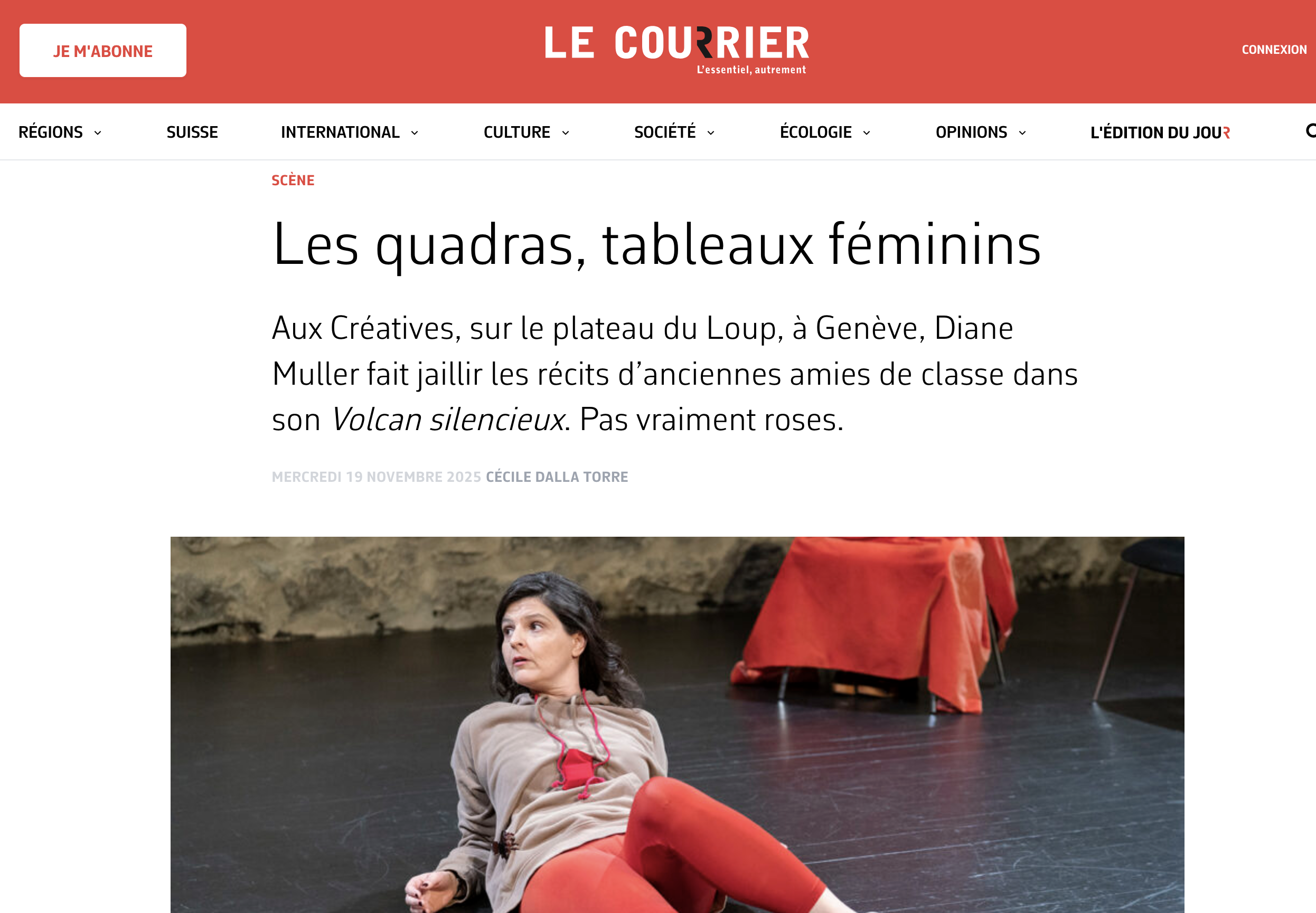 A Genève, le festival culturel et féministe Les Créatives sʹouvre avec une pièce de théâtre. Du 18 au 23 novembre, au Théâtre du Loup, la comédienne Diane Muller porte la parole de ses copines dʹenfance. " Un volcan silencieux " raconte celles que lʹon croit banales et sans histoires. Chronique de Thierry Sartoretti. Tout le programme des Créatives (concerts, conférences et performances jusquʹau 30 novembre) sur le site www.lescreatives.ch