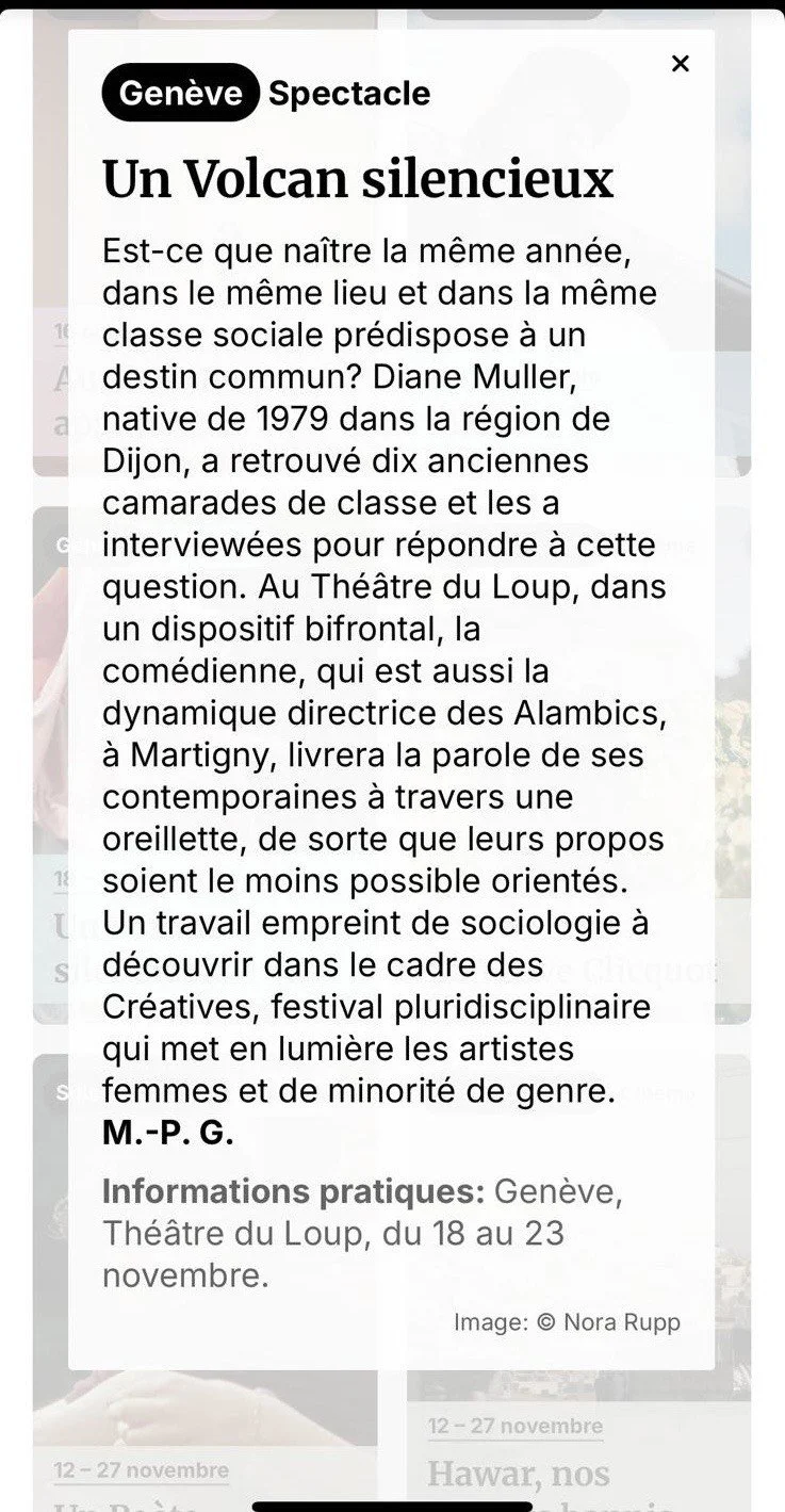 « Un volcan silencieux » de Diane Muller étudie l’impact de conditions de naissance similaires (même année et milieu social) sur le destin des femmes. Le spectacle utilise des entretiens filmés d’anciennes camarades de classe pour analyser les déterminismes sociaux et les modèles familiaux qui ont façonné leurs vies. Au théâtre du Loup, du 18 au 23 novembre 2025.